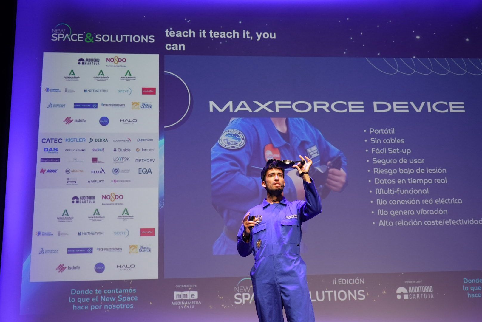 En la sesión de tarde, Guillermo Rojo, preparador físico de astronautas y consultor externo del Austrian Space Forum, destacó la importancia de la preparación física en misiones espaciales y presentó Maxforce Device, un dispositivo portátil diseñado para cuantificar la fuerza en entornos de microgravedad y mejorar el seguimiento del rendimiento en vuelos de larga duración.